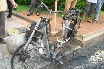 位于茂港区明湖商场旁,本月8日下午时分烧坏一架不值钱的电动车,据知情人说,当天下午14时30分左右,一名中年男子戴着假发隐隐约约地,鬼鬼祟祟地来到车旁,见旁无人,拿起手中的汽油向电动车洒去并点火,事后那名中年男子不知所踪,据民警调查所知,原来是车主拖欠作案人50大元,已拖欠三月至今没归还,作案人一气之下把车主的车烧毁。作案人已落网! [attachmentid=224935]