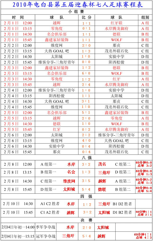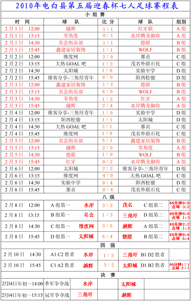 路虎 初中三年级 注册 2009-06-03 消息 523 反馈评分 0 点数 0 2010-02-16 #63 2010年第五届迎春杯七人足球赛全部赛果 部分赛果来源只是道听途说,未经组委会证实,如有记录错误,敬请见谅! [attachmentid=232116] 附件 2010第五届“电白人”迎春杯足球赛-赛程表.PNG 278.2 KB · 查看: 595