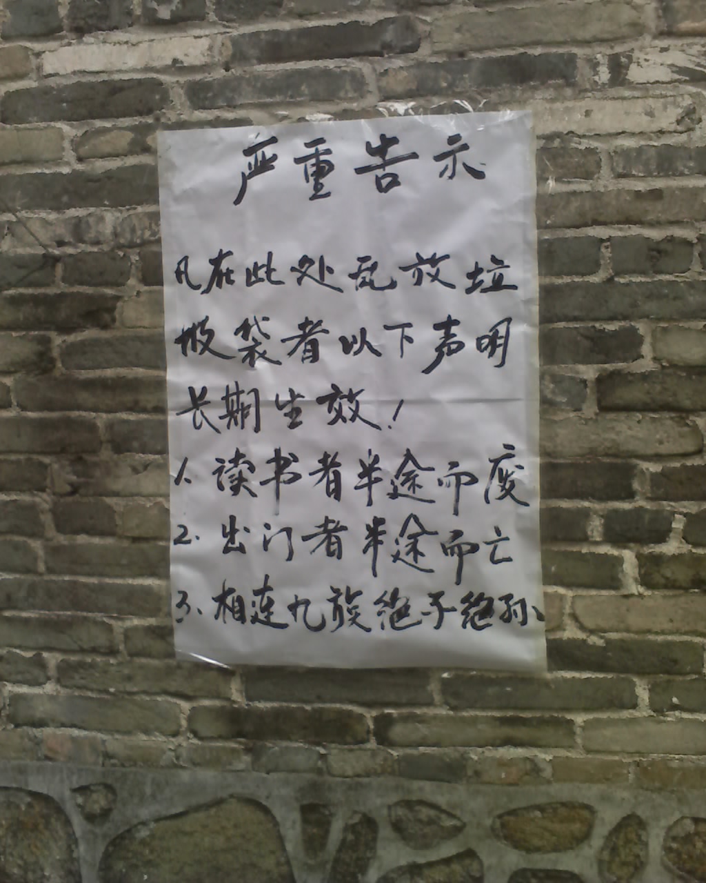 QUOTE(疯疯癫癫说客 @ 2010年03月21日 Sunday, 12:32 PM) 就是骂到他们心灵里面才有效果。 另一广告:在此倒垃圾者 全家死光光光 果然少很多人倒了! 佩服 佩服! [snapback]2942798[/snapback] 可悲的是........在钟鼓楼...................