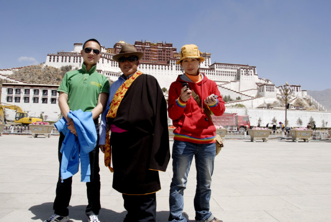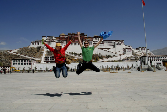 路边不是草原就是沙漠,一望无际,汽车经过了美丽的青海湖,经过了藏羚羊的天堂,经过了牦牛的聚集地,经过了出名的温泉之地羊八井。。。。。。就这样一路把我带到了拉萨。 如果说高原反应,在我到达拉萨的前一天就开始了高反,因为当时汽车经过海拔5000多米的唐古拉山口, 以下布达拉宫门前合影的帅哥是同一班车来西藏的,看到我拿专业相机就缠着要我一起去布达拉宫门前留影