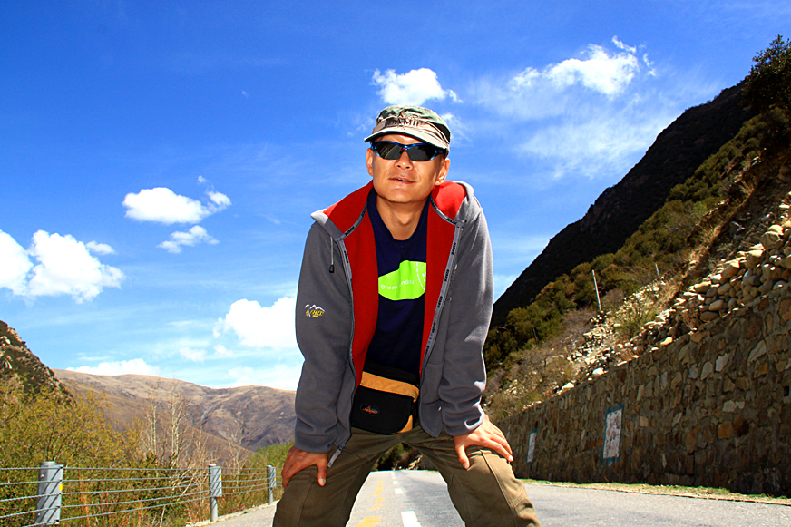 这个帅哥,是林芝二日游坐在她旁边位置的,所幸的是他也是玩摄影的,所以有很多共同言语,。半路上车轮爆胎维修时,她给他拍了几张……他说,他从来没有拍过这种角度的相片…… 他是来自新疆的一个游客……,42岁,