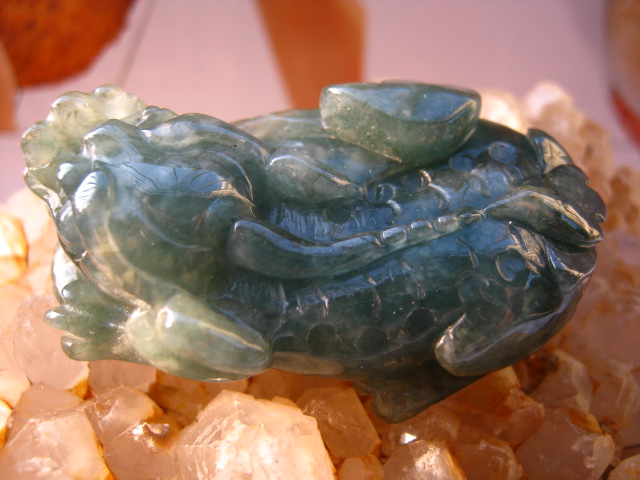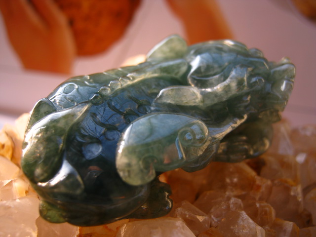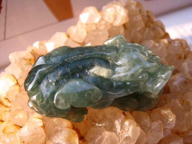 八级:颜色翠绿不匀,晶粒粗,不透明,白花、裂纹多,属干青种。铁龙生翡翠和干青种翡翠不同据有关专家的研究,干青种的主要成分为钠铬辉石,由于铬的含量太高,辉石变了种,而铁龙生就不一样了,主要成份还是硬玉或含铬硬玉,只是颗粒大小和结构疏密有变化,造成有的铁龙生水头不足。对此郭守国教授等人有研究,水短的铁龙生硬玉颗粒粗一点,且结构上较稀疏。干青种解放前就流行,切得薄薄的作耳片,市场上称之为广片。很脆,不耐久。铁龙生发现的时间并不长。有人说从铁龙生的结构和生成条件看,和我们传统意义上的翡翠有一定区别一定要算翡翠的话 存在一个问题 翡翠的范围要扩大了这样的话钠长硬玉也就是我们所说的水沫子,也能归并到翡翠了,何必再设立一个种类但由于现在对铁龙生的研究还不够。