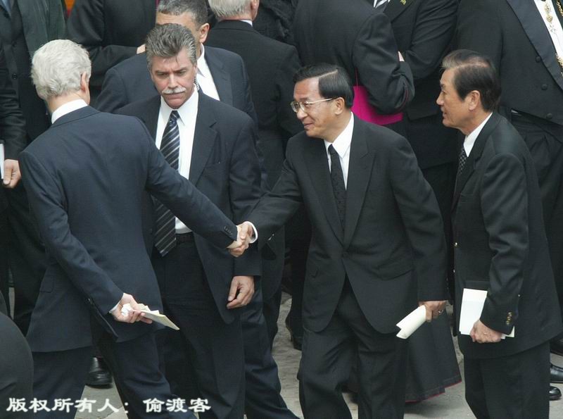 东森重大新闻: 在今天教宗葬礼上,陈水便总统与美国前总统克林顿交谈互动气氛融洽! 陈总统利用进场前的空档,成功迫使美国克林顿前总统用高难度的移动式握手迎接陈总统,在双方短暂而又亲切的交谈中,克林顿前总统一共说了5个英文字母: HI, BYE [attachmentid=17427]