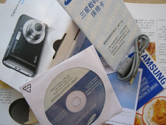 配有原装USB连接线,包装盒、说明书、光碟、保修卡(买来时就只有这些东西了)爽快的送KINGSTOM256M内存卡!自己再买双5号电池就可以用了。