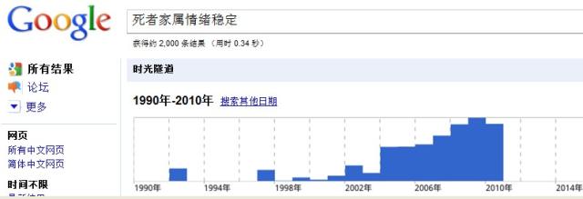 请您在 google 搜索“死者家属情绪稳定”,然后,点击左侧的“时光隧道”功能,嘿嘿,你会发现那个神奇的编年史图,从2004年开始直到2010年,是一个飙升的趋势。