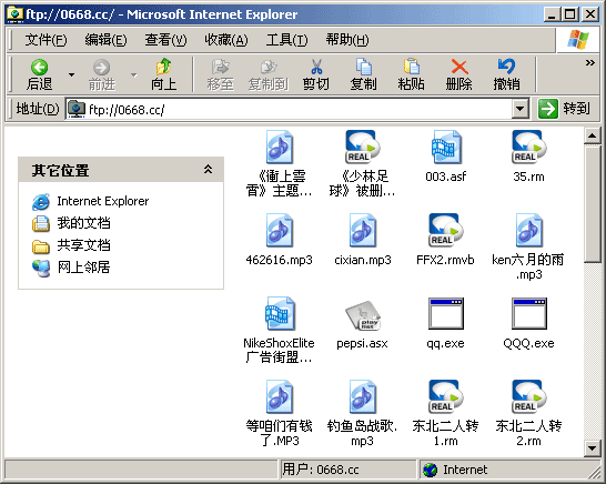 QUOTE(半个人 @ 2005年04月17日 Sunday, 01:16 PM) 在IE上打开ftp://0668.cc 在弹出的对话框输入用户名和密码(用户名和密码在影音天地的置顶贴有)。 就打开FTP了,再把要传的东西复制粘贴进入。 再按那里的说明得到链接。 [snapback]301337[/snapback] [attachmentid=18483] 第一步:在IE上打开ftp://0668.cc [attachmentid=18484] 第二步:按回车键,在弹出的对话框 [attachmentid=18485] 第三步:输入用户名和密码(0668.cc),点击登录 [attachmentid=18486] 第四步:把要传的东西复制粘贴进入(就象在[我的电脑]的操作一样) 注意:本FTP只能读入,不能删除和修改