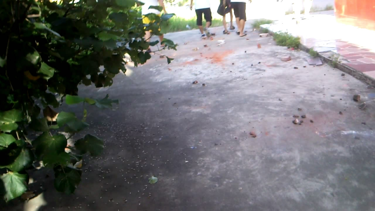 解说一:精神病人所在楼房四周的人行通道散满了掷下的砖块,行人只能快速通过否则就要“中招”