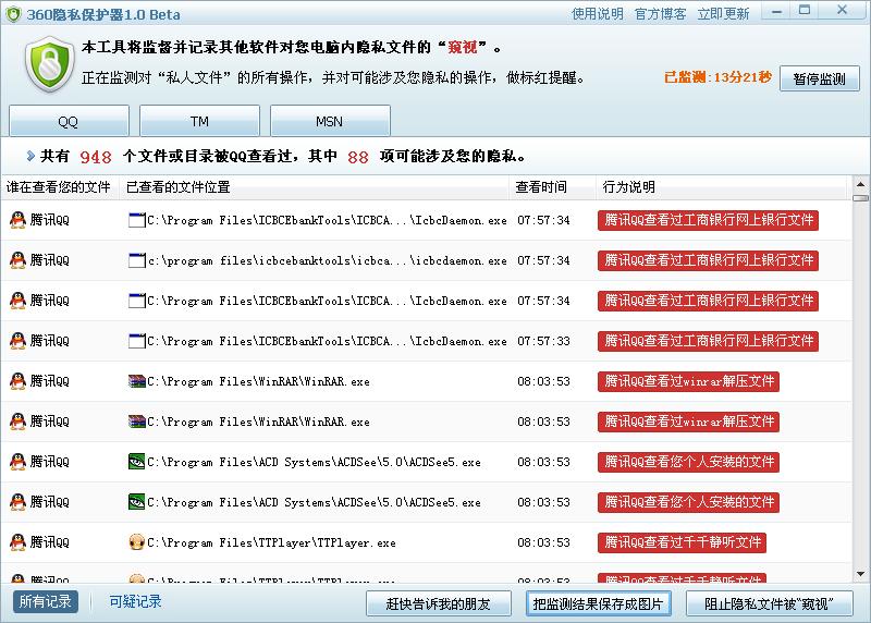 崭 崭新的马甲 初中二年级 注册 2009-09-24 消息 451 反馈评分 0 点数 0 2010-10-05 #1 平时以为上个QQ能与亲人、朋友、同事们聊聊天什么的,哪知最近在360安全卫士的提示下检查了一下QQ才发现腾讯实实在在是个偷窃狂,大家来想想办法吧。 附件 360隐私保护器截图.jpg 107.2 KB · 查看: 350
