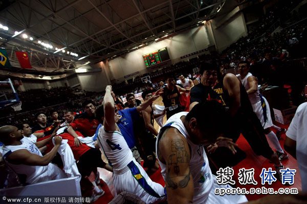 比赛重新开始后不久,在一次进攻中巴西队和中国队球员在篮下发生了摩擦,随后双方互有推搡动作,裁判虽然响哨但是仍然没能制止两边的球员,很快篮下的球员动作变得越来越大,而场外的球员们也全都涌入。