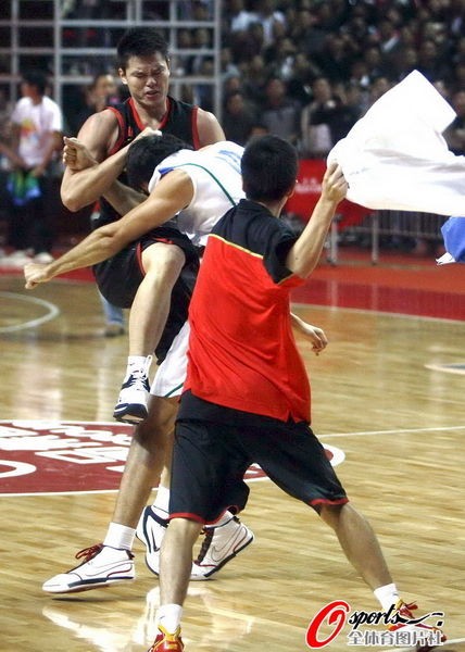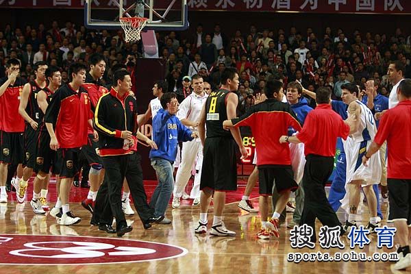篮下的摩擦终于演变成了双方的全武行,所有的球员都冲进了场内,现场一片混乱,双方的领队马上上前拉开球员们并进行劝说,领着各自的球员走回半场。