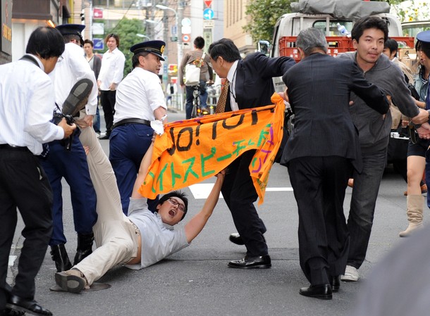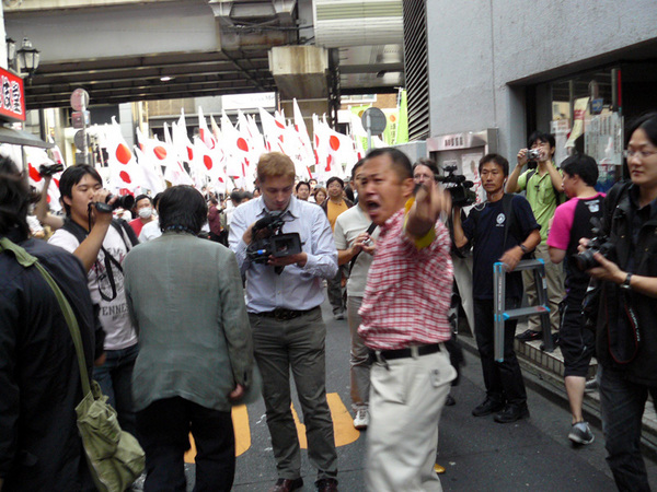 今天(16日)东京反中游行场面基本平和,只发生一次事故,两名反排外的日本人试图阻止游行,被游行者追打,反排外者被警察架走,追打的游行组织者以为是中国人,气愤地高喊“支那人滚回去”。