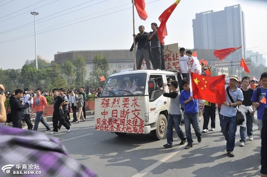日 本 媒 道 , 成 都 的 示 威 青 年 超 ^ 1 f 人 , 他 下 午 在 市 中 心 [ 行 , 高 叫 口 , 誓 言 捍 o ~ u 主 , 抵 制 日 。 有 日 Y 百 的 窗 被 破 , 示 威 者 在 傍 晚 散 去 。