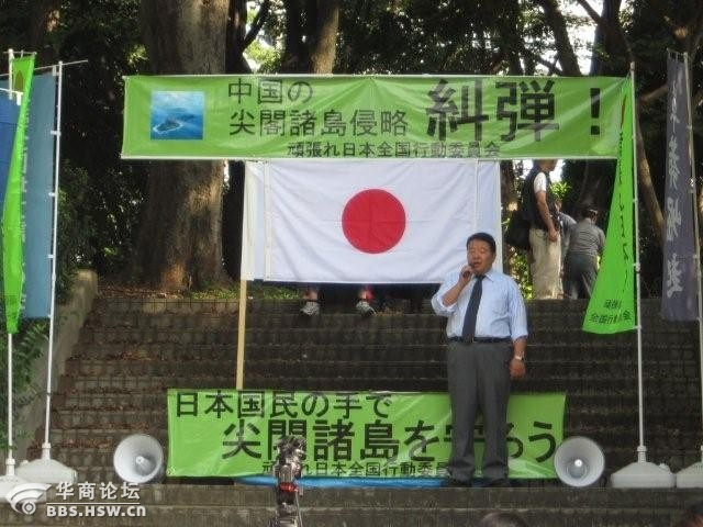 日本自卫队前空军司令(航空幕僚长)田母神俊雄和前众议院议员、登上过尖阁列岛(中国名“钓鱼岛”)的西村真悟等也一起来到中国大使馆前,田母神俊雄当众宣读了抗议文。但是中国大使馆大门紧闭,没有人出来应答。