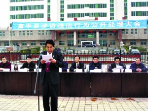 回应:记者在富平县法院网看到该网站刊载了一张公开处理大会的照片,3月5日当天,站在富平县政府广场上念稿子的官员正是该县法院副院长奥绘。背后列席的官员中,该县政法委及法院的主要领导都在。