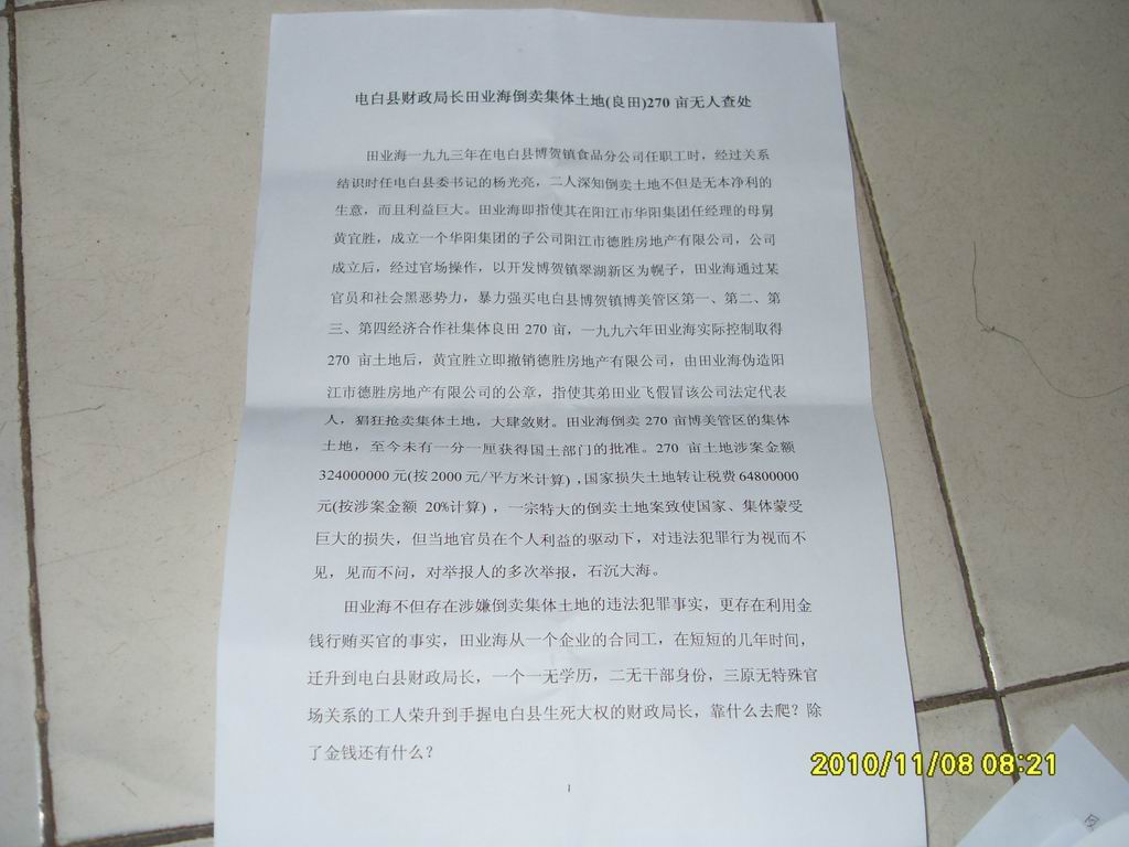 田×海这名字在电白论坛出现的次数真不少,从《最富的县委书记》一文开始,到《全国最贵猪肉》等十多篇,现在又涉及到倒卖集体土地问题,可算是电白正局级干部中被举报最多的一位。
