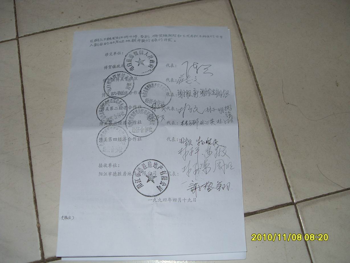 注:1、博贺镇翠湖新村土地移交书。(田业强买270亩良田倒卖)
