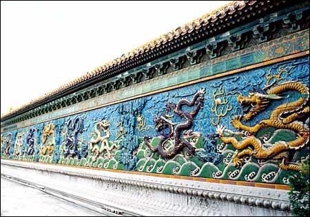 九龙壁的正面共由270块烧制的琉璃塑块拼接而成,照壁饰有九条巨龙,各戏一颗宝珠;背景是山石、云气和海水。编辑本段图形  九龙壁上面的九龙,形体有正龙、升龙、降龙之分,每条龙都翻腾自如,神态各异。为了突出龙的形象,工匠们采取浮雕技术塑造烧制,富有立体感;并采用亮丽的黄、蓝、白、紫等颜色;使得九龙壁的雕塑极其精致,色彩甚为华美。有关专家认为,故宫九龙壁之所以看起来活灵活现,是因为工匠们在配制色调的时候,采用了色彩补偿的原理,十分令人赞叹。编辑本段巧补故宫九龙壁  在故宫皇极门的南侧,有一座建于清朝乾隆年间的九龙壁,设计精巧,造型独特。壁上的九条龙神姿各异,腾跃于祥云之中,鳞光闪烁,栩栩如生。如果您仔细查看,会发现从东边数第三条白龙的身上的一块琉璃瓦与众不同,原来它是后补上去的。编辑本段工匠马德春与故宫九龙壁  这建九龙壁可不是一般的工程,讲究多、难度大。必须要找那些技艺高超的人才行。工部大臣选来选去,最后选中了一个叫马德春的工匠。这马德春烧制琉璃瓦十几年了,技术高超。他选几十位工匠,第三天就开工了。干活前,他向工匠们讲了烧制彩色琉璃瓦的要求。他说:“那烧制彩色琉璃瓦对材料的配比和火候的掌握,非常讲究,要是掌握不好分寸,烧制一件琉璃成品,就得有十来件废品作为代价。大伙要多留心,千万别出差错。”说完就带着大伙儿干了起来。他们费了九牛二虎之力,足足烧了七七四十九天,总算烧制成了。  安装这天,皇极殿门前人来人往,工匠们有条不紊地忙碌着。突然一声清脆的响声传来,吓了马德春一跳。他来到出事地点一看,一个小工匠呆呆地站在那儿,直勾勾地盯着摔碎的一片琉璃瓦。马德春小心翼翼地把碎琉璃瓦片拼凑在一起,仔细地看了看,低声对周围的工匠说:“这事儿对任何人都不能讲,谁要是吐露一个字,可有杀身之祸啊!”  在回家的路上,马德春的心是七上八下,他想重新烧制那片琉璃瓦是来不及了,延误工期的罪名担当不起,可是另打主意来补救又要冒着欺君之罪的大险呀!眼看没几天就是交工期了,他把心一横,等死不如闯一闯。到家后,他茶不思饭不想,不管谁来也不见,一个人来到小仓房,把门窗挡严,悄悄地自制“琉璃瓦”。  九龙壁完工的消息,及时上奏了皇帝。第二天乾隆就带着几位大臣前往观看,刚一进锡庆门就赫然看到那座金碧辉煌的九龙壁。走近再一细看,那九条龙栩栩如生,就和真的差不多。乾隆皇帝顿觉满目生辉,不住赞叹。他走到壁前,仔细欣赏每一片琉璃瓦上的巨龙,从东到西,一条龙一条龙地观看。跟在人群后面的马德春心都快提到嗓子眼了,头上冒着汗,腿有些发软。那乾隆来回看了三遍,真是从心里喜欢,连连称赞马德春的手艺高超,并重赏了他五百两银子。送走了乾隆皇上,马德春那颗悬着的心才算落了下来。要问马德春为什么提着心呀,那是因为他移花接木巧补了九龙壁。  原来为了补上小工匠摔碎的那片琉璃瓦,马德春费尽了心机。他用了两天两夜的工夫,硬是用一块上好的楠木雕成了一条龙,并在乾隆带着王公大臣前往观看的头一天才匆匆忙忙地安装上,这要是让皇上知道了,就是欺君之罪呀!  而今你若有机会游览,来到九龙壁前,从东边数第三条白龙的身上有一块琉璃瓦就是当年马德春用楠木雕成的,您不妨仔细地瞧一瞧。