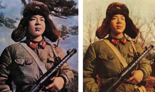 共产主义战士雷锋,1965年,原片中凌乱的灌木被修掉,换成了挺立的松柏。