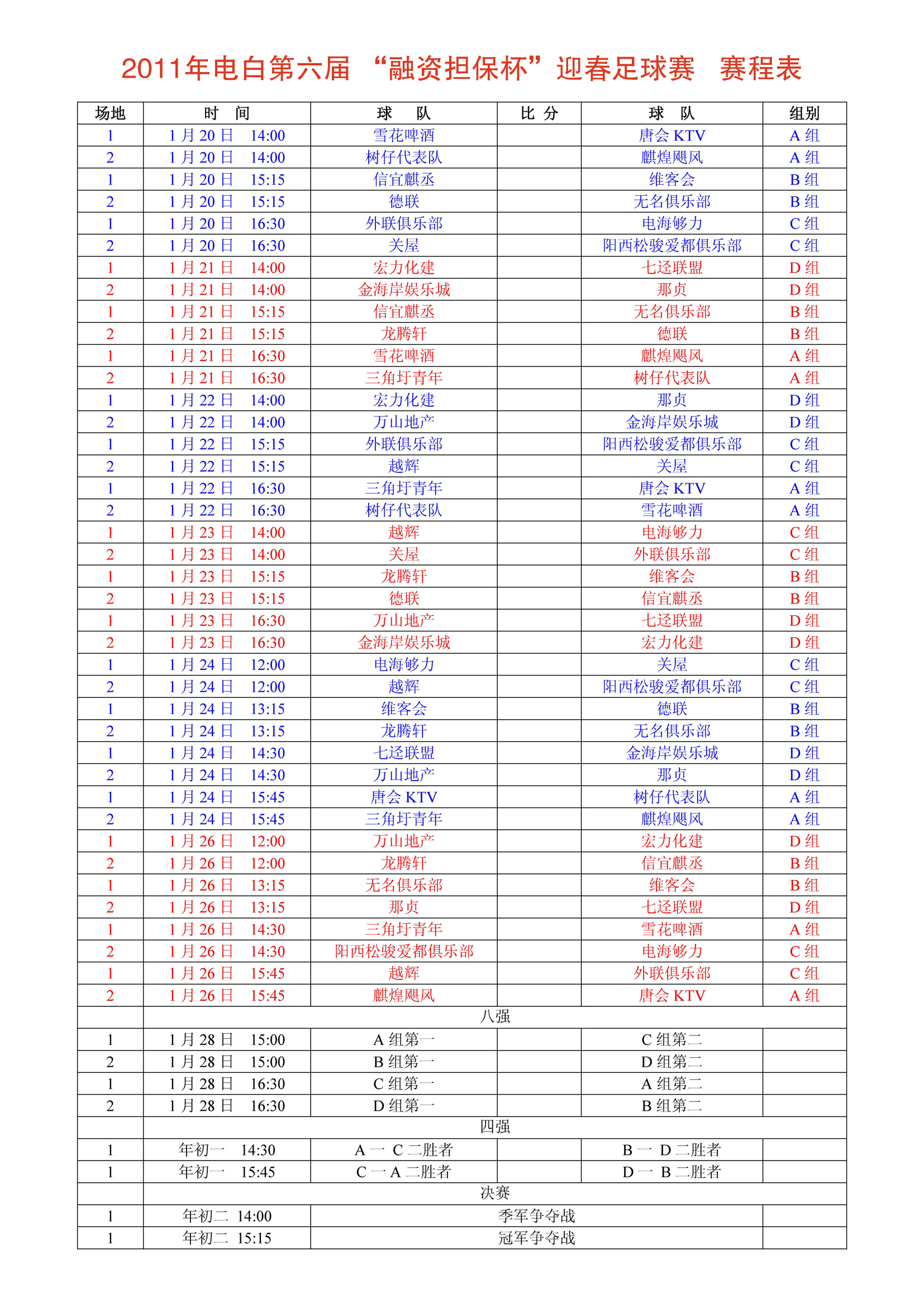 QUOTE(球是圆的 @ 2011年01月16日 Sunday, 12:14 PM) 感觉宣传力度不够往年。。。 [snapback]3084813[/snapback] 2011年电白第六届“融资担保杯”迎春足球赛在电白境内电视宣传广告播出时间,本港19:00,22:30翡翠20:45,22:05电白20:55,22:05中午12到13点之间有两次(电视广告播出时间段),从1月14日到比赛期间,滚动播出,敬请留意!