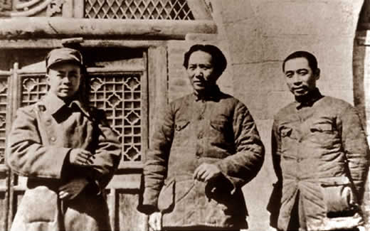 1938年初,毛泽东、周恩来、任弼时在延安。