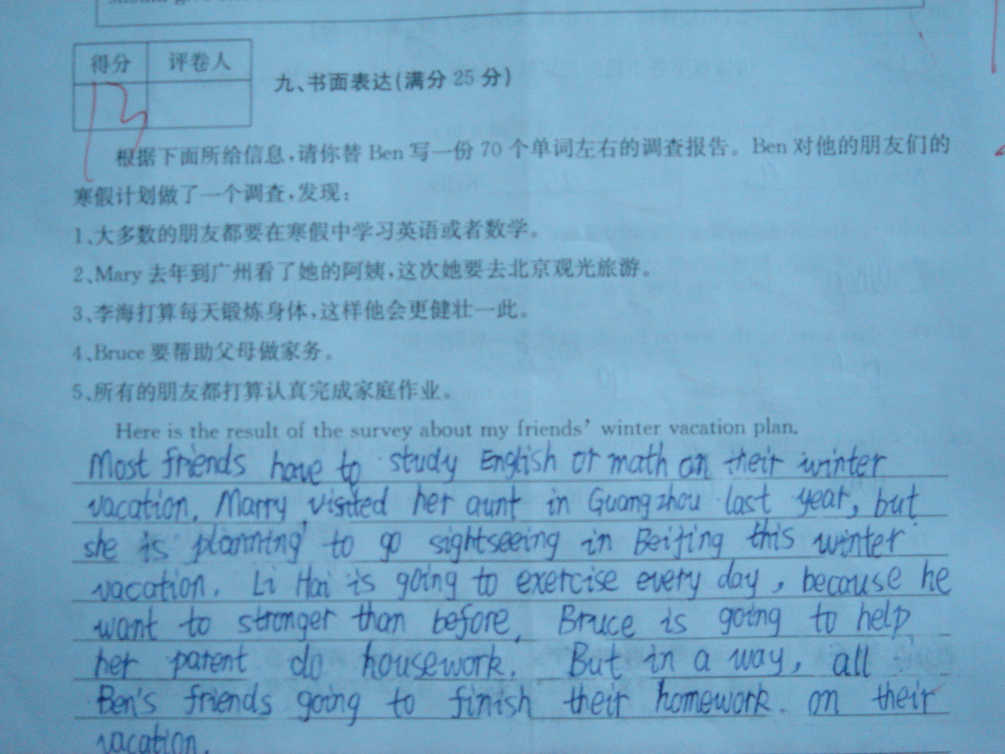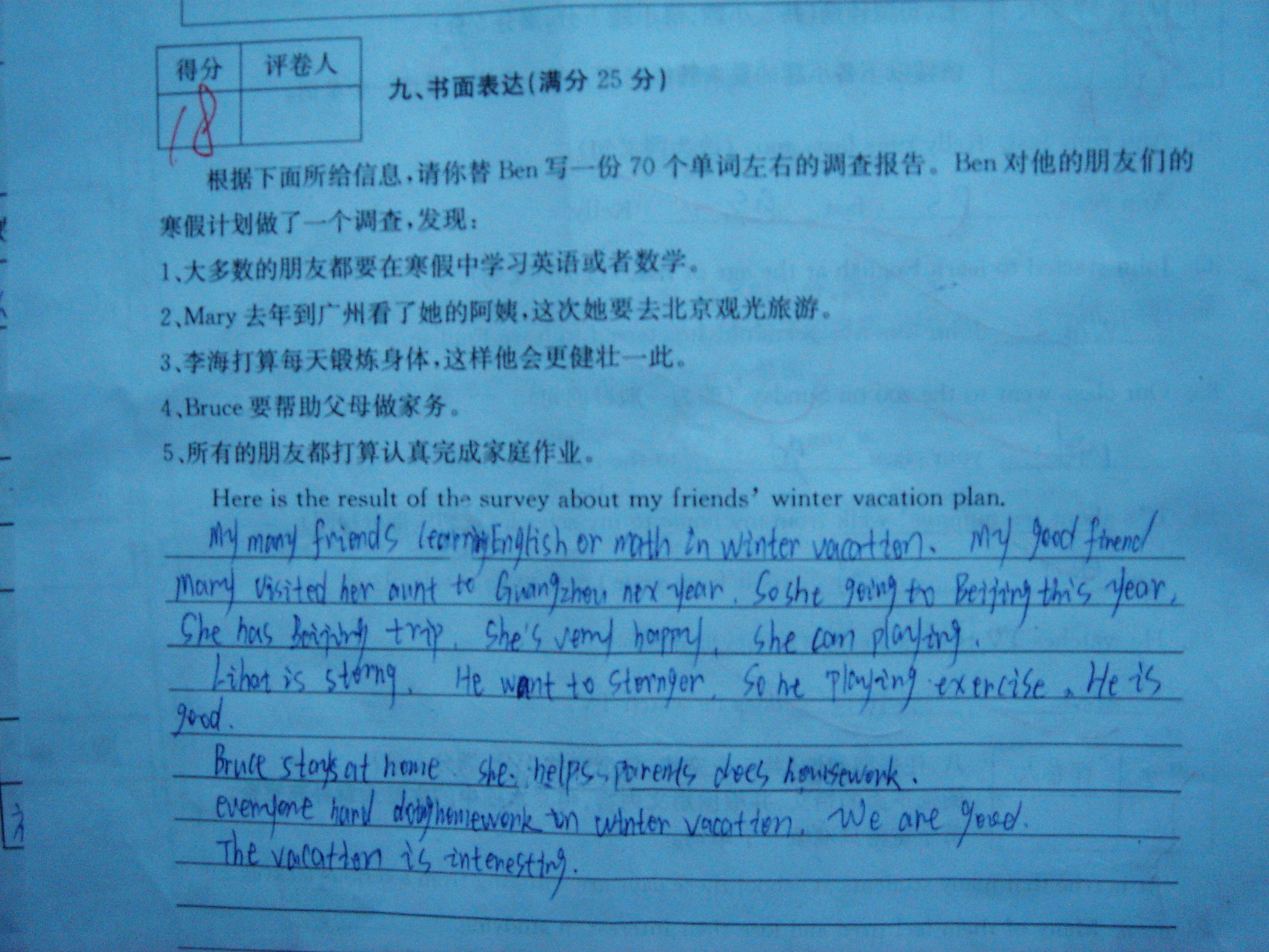尽管英语的阅卷基本上实现了现代化,但广东的试题还不至于全部扼杀英语传统的“手头功夫”――“写”的要求,还有作文。因此,现代化不可能取代阅卷教师的劳动。但从阅卷老师所提供的情况来看,这又是“一忧”。据说,每个阅卷老师每天工作7个钟头。中间休息两段时间――上午中途休息20分钟,下午同样。现按照阅卷的速度来划分阅卷教师的质量――优者每天700-800份卷(指单阅作文卷);中者400-500份;劣者200-300份。也就是说,优者每份卷用不到30秒,中者仅用了一分钟,劣者也不到两分钟。这也仅是个平均水平,若情况特殊的话,那就更加有限了。就在这么短的时间内,我们的大笔一挥就决定了考生当年的命运了。我们的老师发现了作文阅卷的空子,因此,就教差生如何去“蒙”,如“照抄原文”呀,“照抄阅读理解中的文段”等等!倘若这样下去,我们又会造就一大批“投机取巧”者。