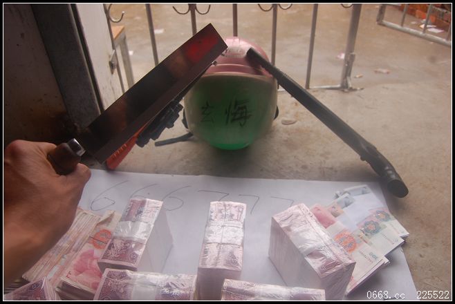 此图乃“湖海山人”在家中所作,即“湖海山人”家门防卫已尽失,家门洞开,催魂之灵已入家中。况“玄海”之兵马DD催命之灵铜皮铁骨,刀枪不入,尽管“湖海山人”乃黑道人物,手中有黑枪,有菜刀,但如何对付得了已入屋之灵?从其所作两张图片的冥币来分析,其买路钱如日剧增,从“五毛”小币增至百元大钞,看来“湖海山人”真的担心买路钱不够了!不过有“玄海拾贝”所赠玄语数句,足可通关矣!