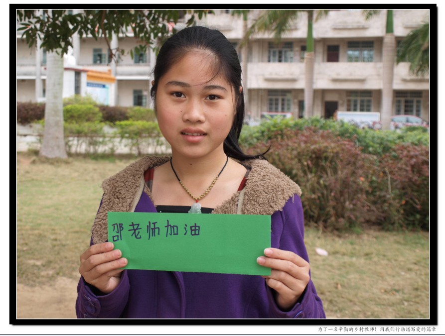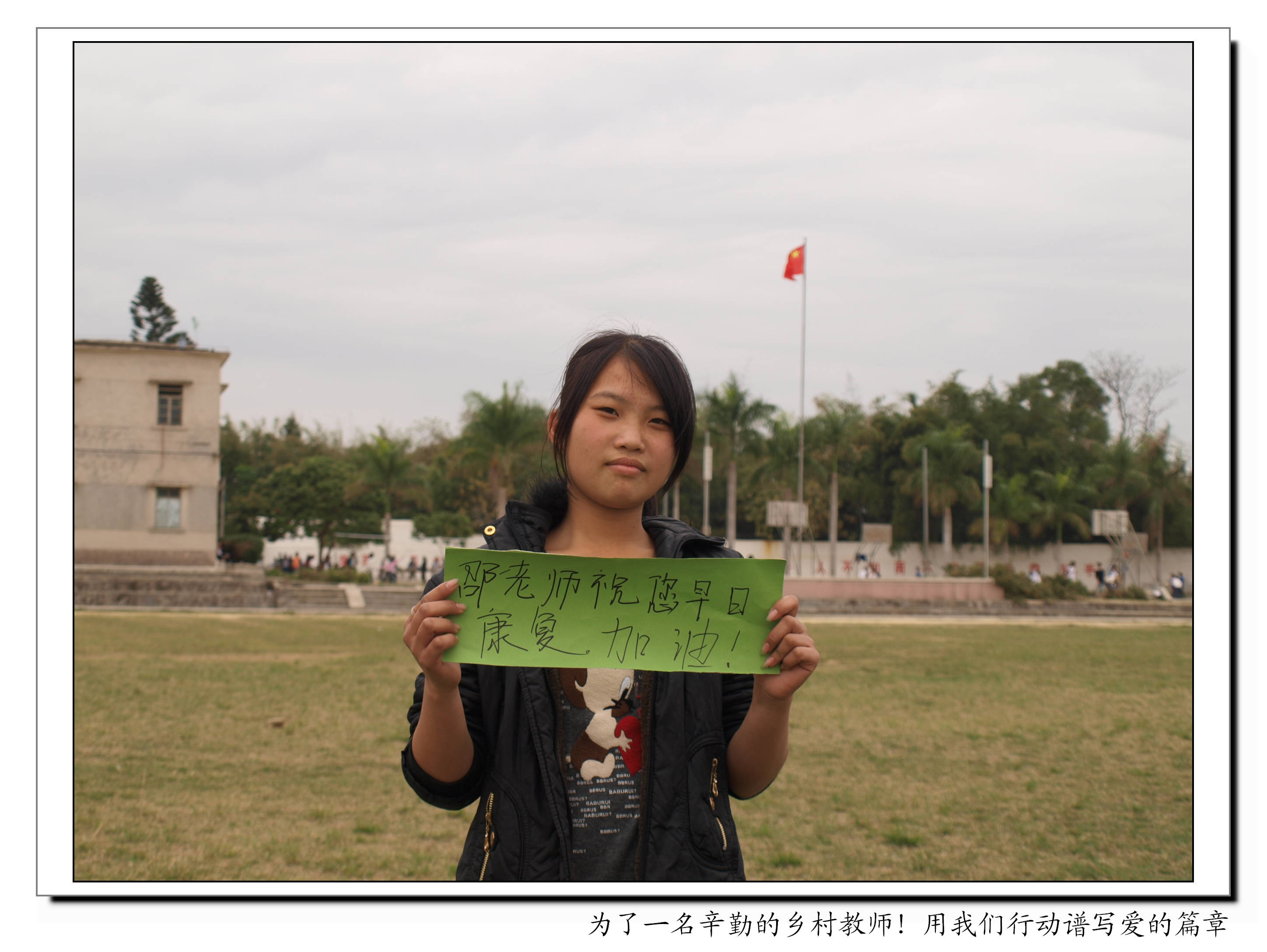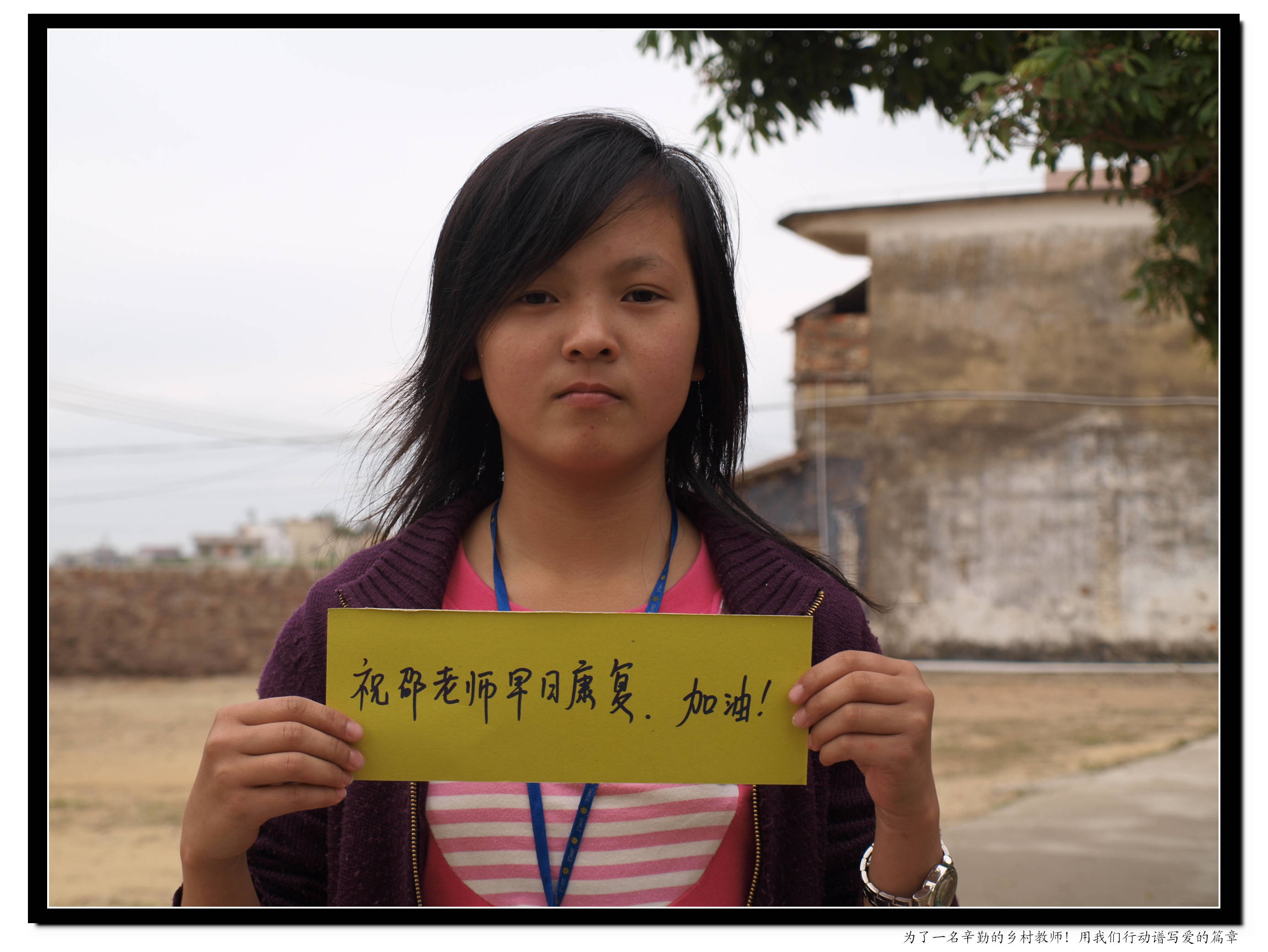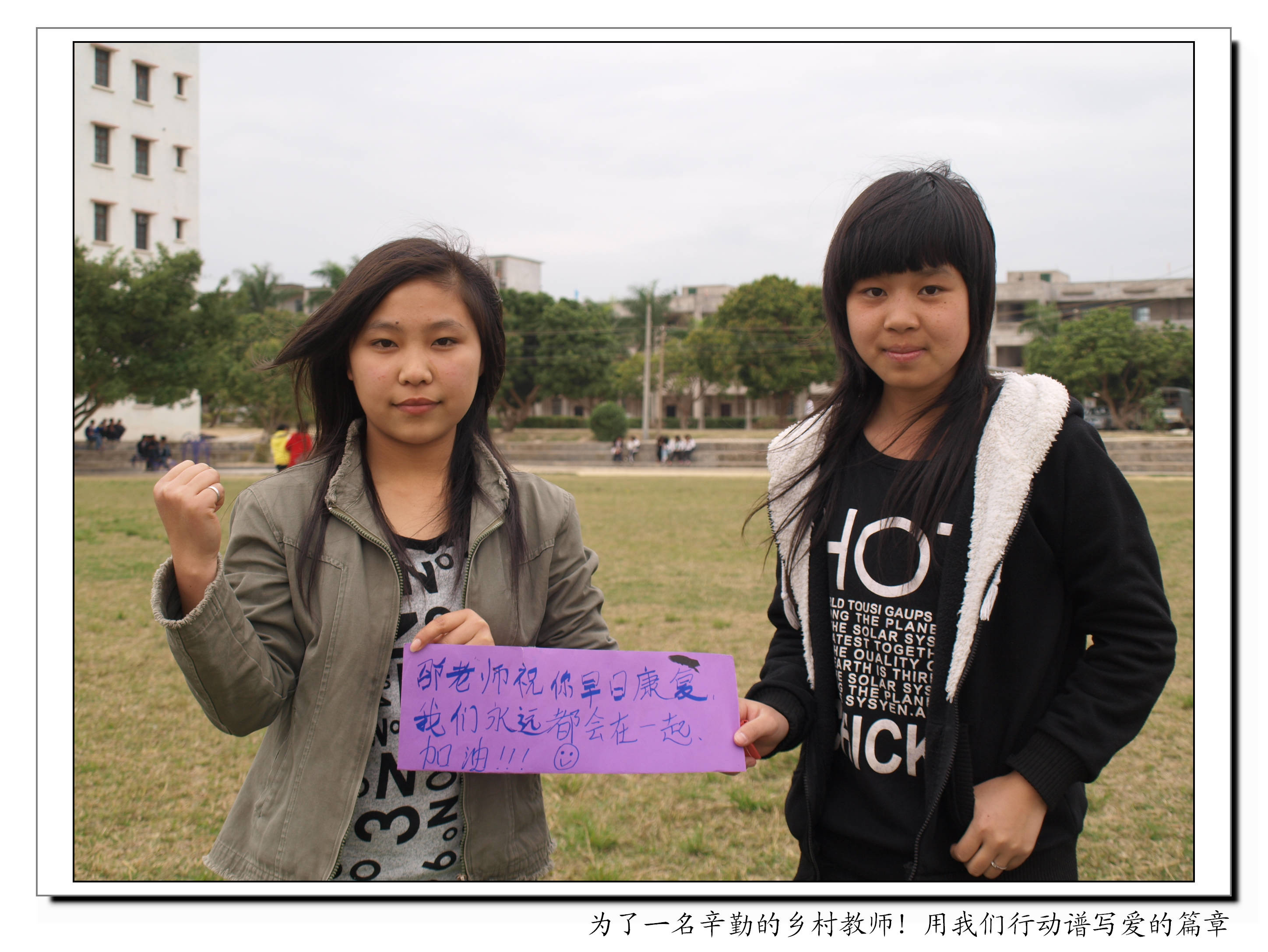 还有关于学生拍照的时候的表情,很多同事说跟楼上的一样!可是我觉得支持邵老师,为他打气我们就不要太悲,因为照片的祝福语都是送给邵老师一个人的,让他看到曾经在学校看到那些灿烂可爱的面孔,他会更坚强起来。当然,照片传到论坛上,网友们也会看到会做出各种猜想,不过我觉得孩子的真心的善意超乎了所有不必要的疑虑!