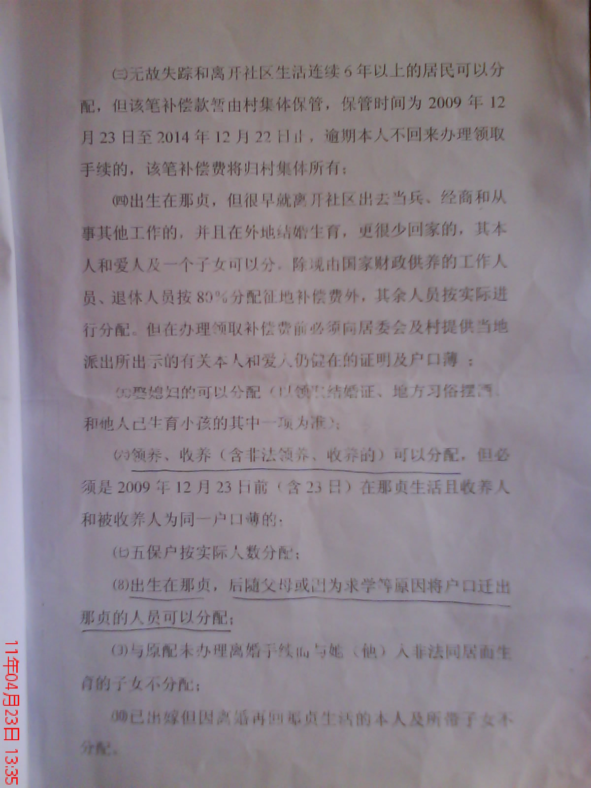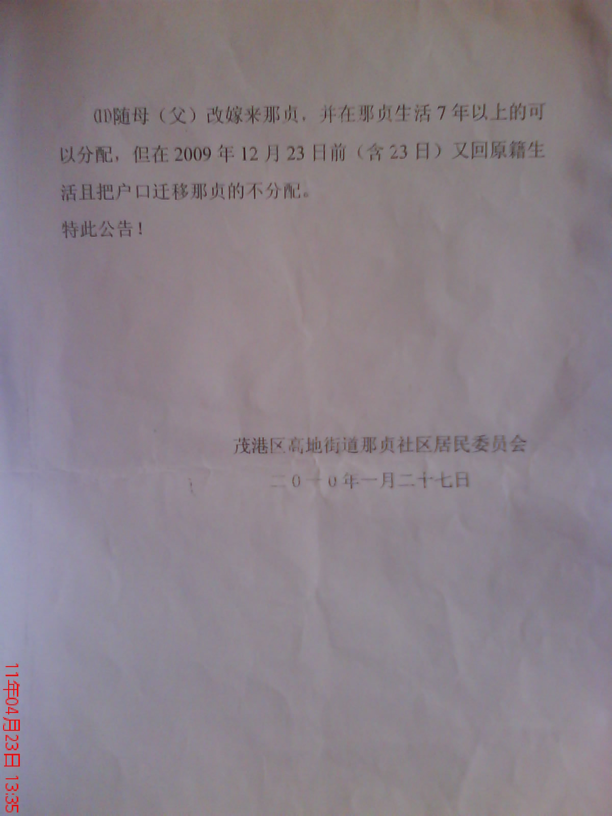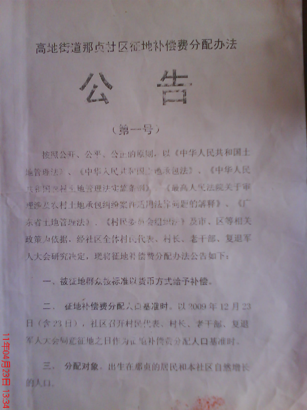在于2009年12月23日(含23日)那贞社区征收民用海田,同时出份文件《高地街道那贞社区征地补尝费分配方法》,并在2009年12月23日量土地。
