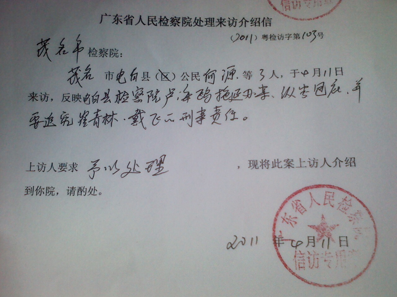 茂名市OR电白县的办案有如此高的效率?4月11号省厅才接收的信访,13号就已经解决???