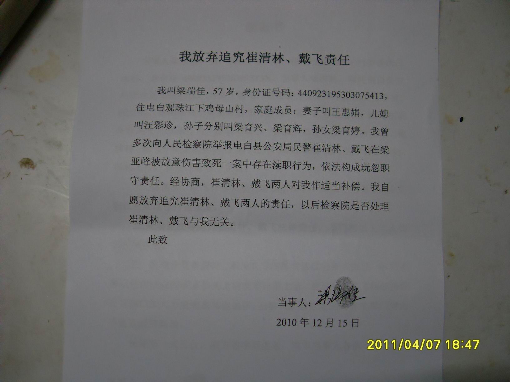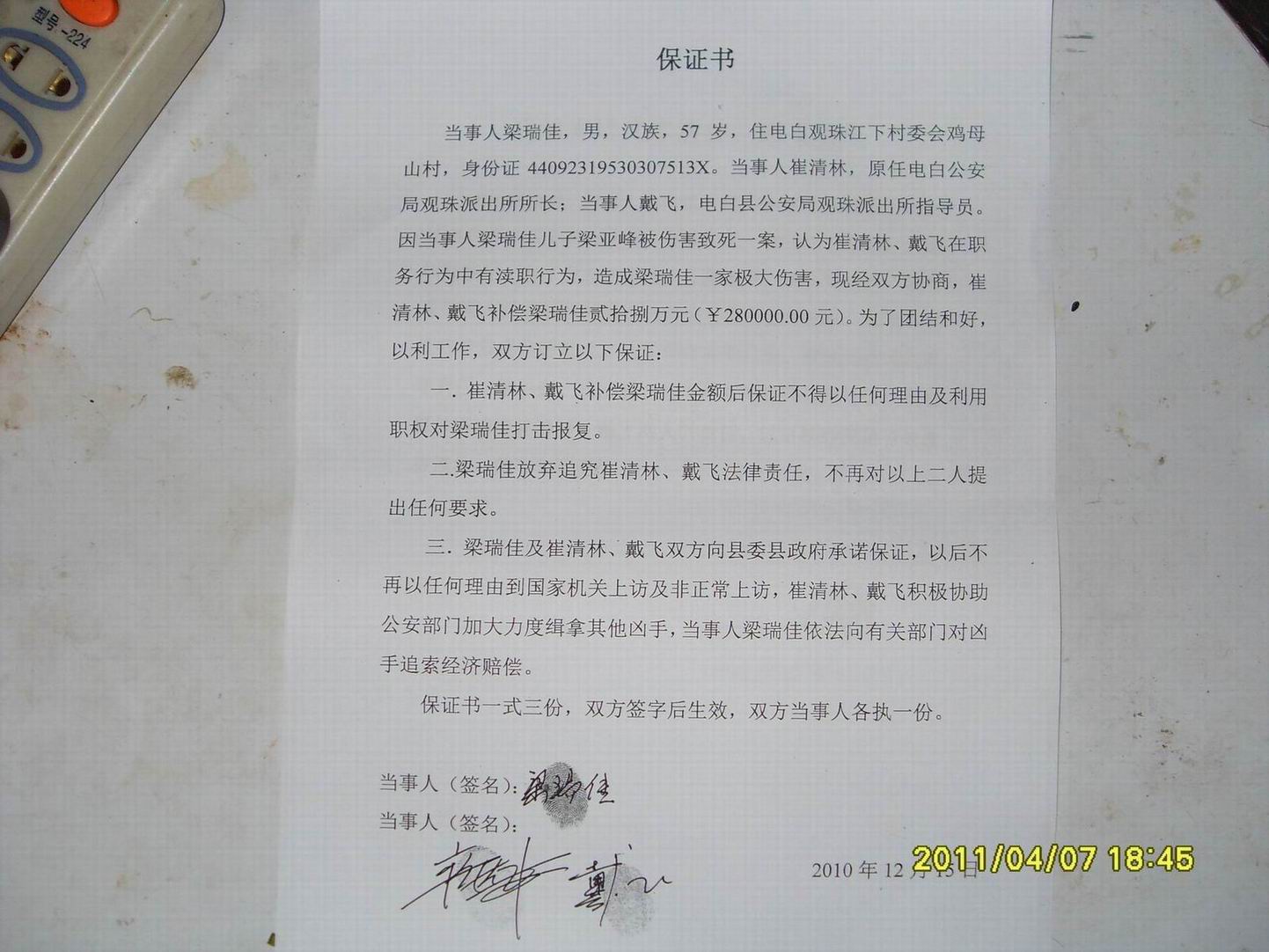 据我了解,梁瑞佳这件事情已经经过县信访部门解决了,在前两天有个自称是记者身份的人打电话给崔某人。他向崔某人索要几万元,否则把这个帖子放上电白论坛或其他网站,崔某人不答应,所以就把此帖放在这里了。目前媒体喜欢搞这套腐败现象来对他人进行敲诈勒索,现在执法人员更视为社会最为弱势的群体,无奈。。。