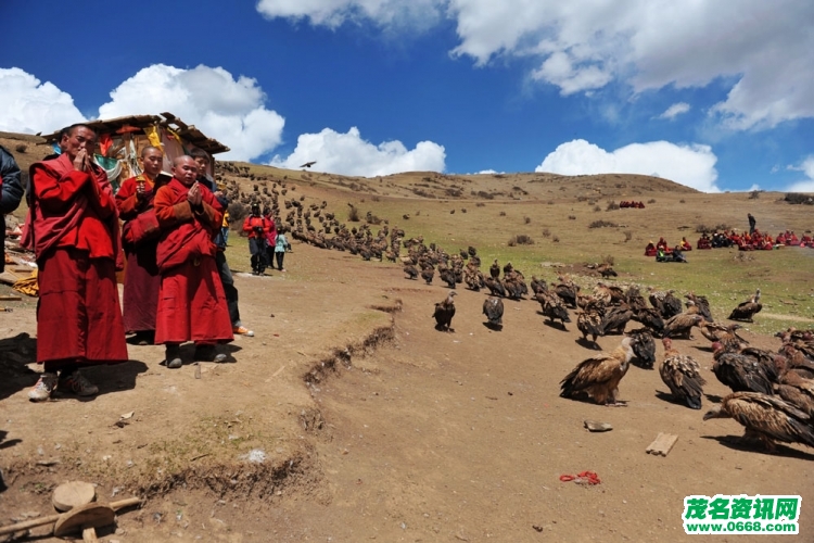 天葬----一件高规格的葬礼,人死后由天葬师在天葬台上把人肉割下后抛向天由雕食之,骨头也须砸碎形成骨泥抛出,天葬是藏族一种很神圣的仪式,信仰不同接受的教育不同所以觉得恐怖.对藏民来说,天葬是很神圣的。