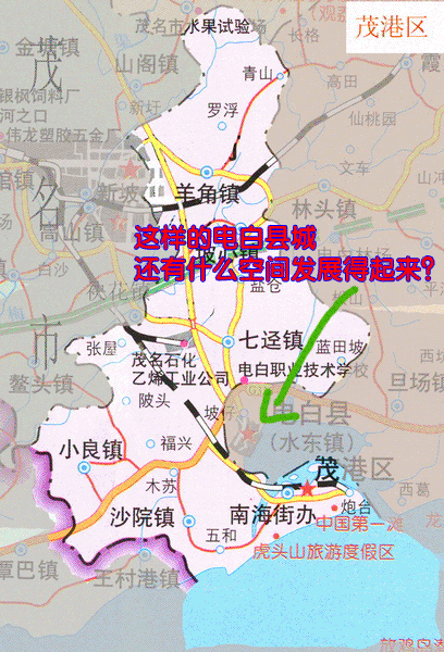 再有一个猜疑就是,假如水东合并了所谓的茂港区,区名什么定?茂港的港才几万吨小港,和电城北山港30万吨相比,实在名不其实,这个名字叫“海滨区”?水东人民不答应,叫水东区,可能还可以接受!茂名水东港回来了,水东第一滩也回来了,电白假如不是迁县,剩下的由旦场分开,假如电白整体改区,改成博贺区?电白人民不接受,改在电城区?山区人民又不接受,整体改成电白区。也许可以勉强接受一点。。但好不是成区,是迁县电城最合理!