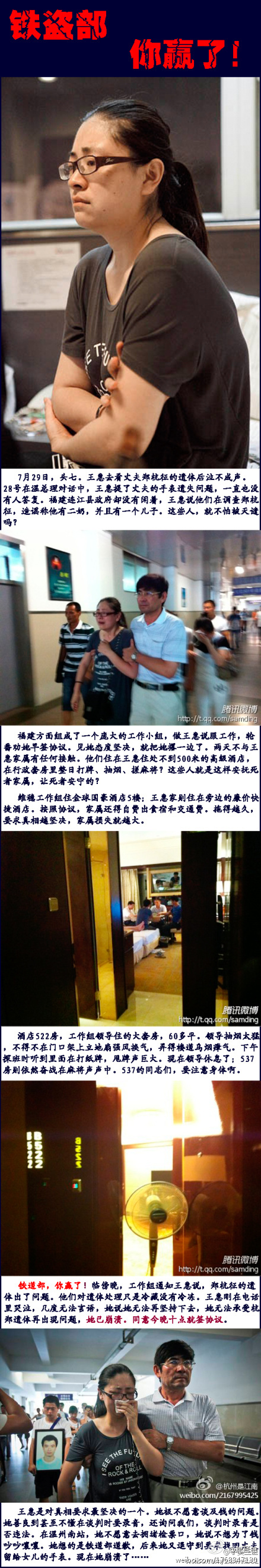 @康少见:刚给王惠女士去电话,她证实,此事属实。她说,昨天下午,两名铁道部善后人员相互间“大声聊天”,说其先生的遗体未冷冻,而是冷藏,“都有苍蝇了”。这句话让王惠听到,她“瞬间懵了”,决定不再追究任何问题,同意签协议。今天下午,她在协议上签了字。与其他遇难者一样,赔偿金是91.5万元。