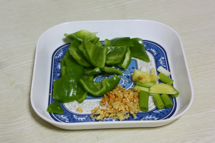 炸蒜蓉、葱段、姜片、青椒改滚刀块,大小跟肉块差不多就可以