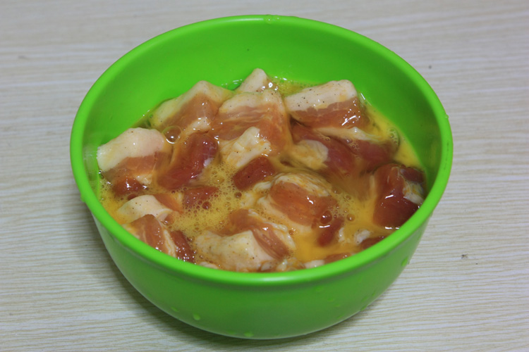 取一个鸡蛋打匀,将腌好的肉倒入混匀