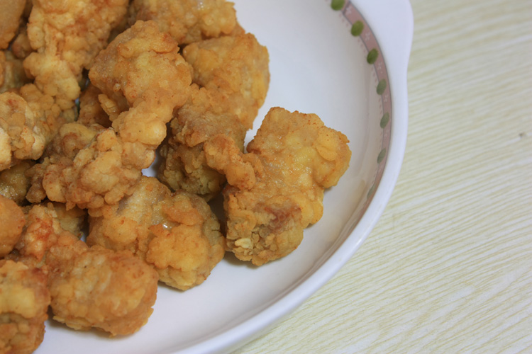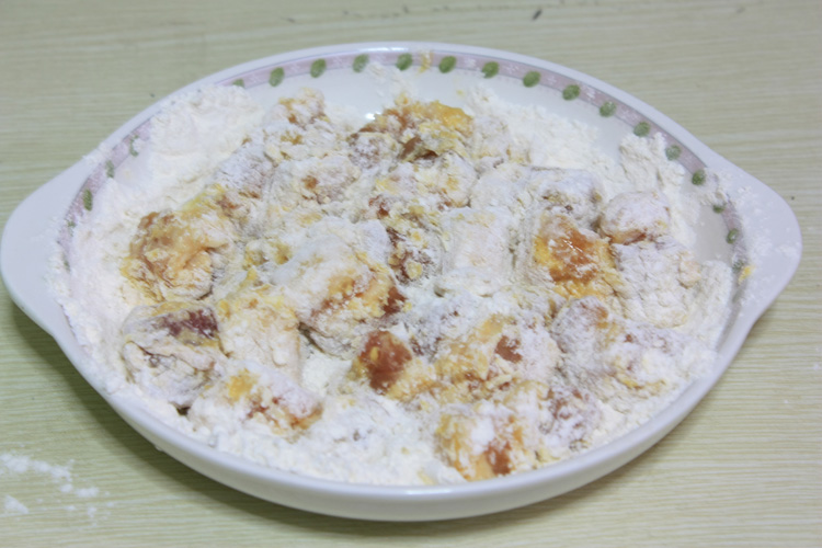用罩筛筛去多余面粉,热锅倒入色拉油,烧至7成热,将咕K肉一块块放入,然后改中小火炸至金黄色捞出控干油