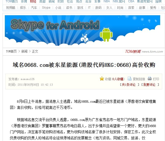 8月8日上午消息,据消息人士透露,域名0668.com最近已被东星能源(原香港饮食管理集团)高价收购,价格可能高达千万港币。