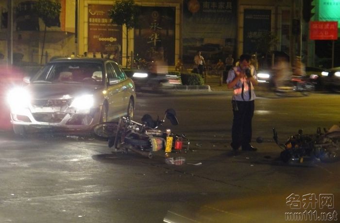 昨天晚上8点多,巡防队员在市十六中门前发现一辆可疑摩托车,随即报告带班民警,并招呼队友共两车四人一前一后开始跟踪。经过毛家饭店后,可疑车辆突然加速,两名队员也跟上去。行走100多米,可疑车辆在健康南路路口与一辆小车相撞,两名队员也撞了上去,三人均受伤。支援队员立即打120,但救护车没来,最后由人民医院一个护士推一部床车到现场。小车司机夫妇和我们协助护士推床车回人民医院,受伤的治安队员则由队友搀扶过去。经查,可疑车辆的发动机、车架号码均已磨掉,经刑警部门复原调查,该车于2009年1月19日在茂名市宾南路被盗。