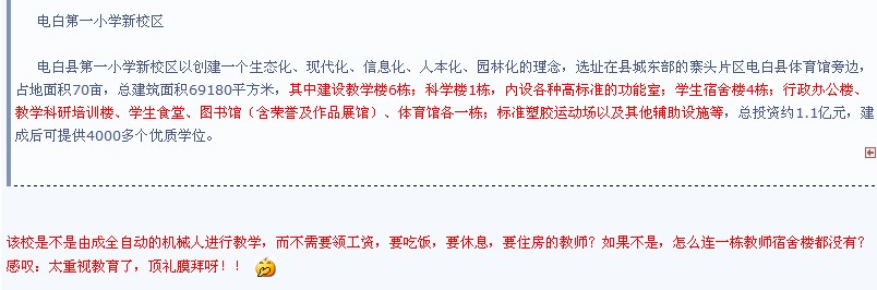 该校是不是由成全自动的机械人进行教学,而不需要领工资,要吃饭,要休息,要住房的教师?如果不是,怎么连一栋教师宿舍楼都没有?