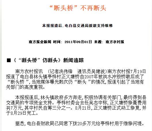 因为你们让“断头桥”不再断头,在此,本人谨代表六千亭梓村民感谢你们!