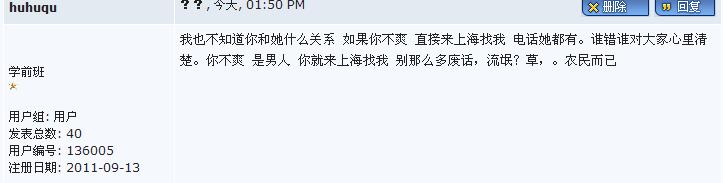杀 杀虎使者 大学二年级 注册 2009-04-15 帖子 776 反馈评分 1 点数 1 2011-09-15 #83 QUOTE(huhuqu @ 2011年09月15日 Thursday, 01:43 PM) 你不爽啊 那来上海啊 ,电话要不。。要不要我给你买机票?省得你游泳来上海; [snapback]3218125[/snapback] 附件 360截图20110915140824453.jpg 18.7 KB · 查看: 350