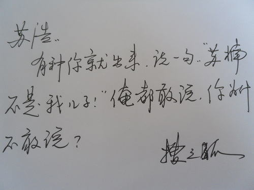 12日,山西省公安厅副厅长、太原市公安局局长苏浩对记者称,他与“李双江之子打人事件”中另一肇事者苏楠的父亲苏文斌并无关系,工作中也没有任何业务来往,是其(指肇事者)母谎称自己是苏楠的大伯。此前,山西省公安厅一位干部对媒体称,苏浩与苏文斌及苏楠“关系密切”,但他很确定地称“苏楠不是苏浩儿子”。