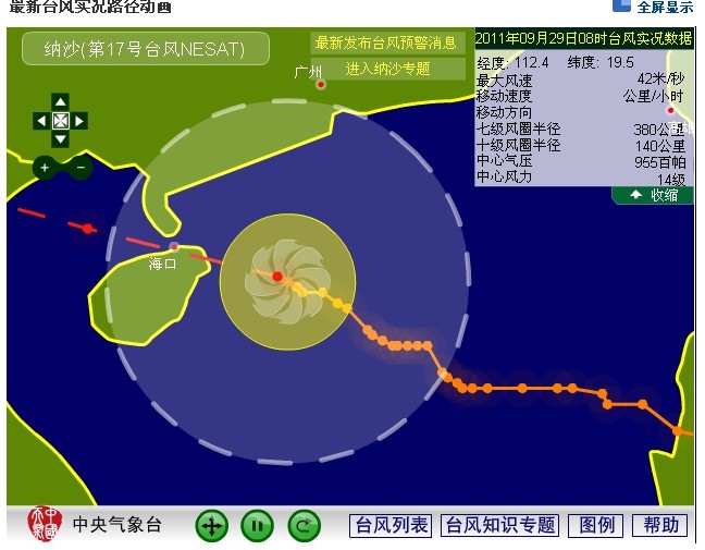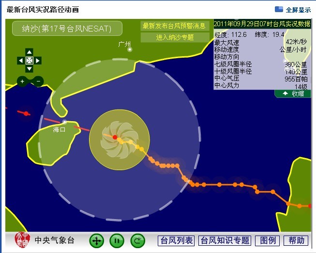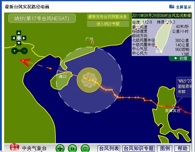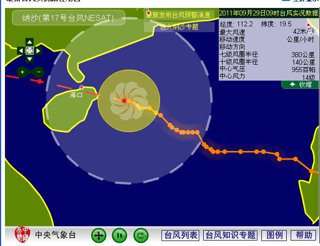 2011年第17号台风“纳沙”中心9月28日20时位于海南省文昌东偏南方大约450公里的南海北部海面上,就是北纬18.2度,东经114.8度,中心附近最大风力13级(40米/秒),中心最低气压960百帕。过去1小时向西移动了约20公里,强度继续维持。