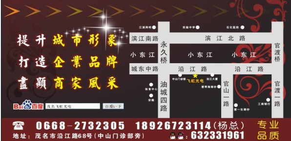 茂名飞虹光电现招聘广告制作师傅,制作学徒多名,待遇:面谈。上班地点:茂名市区。联系电话:0668-2732305,18926723117陈小姐