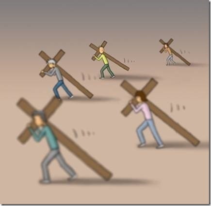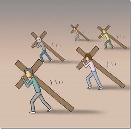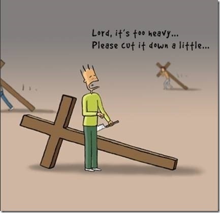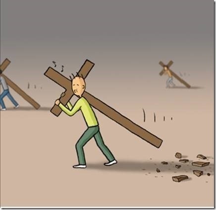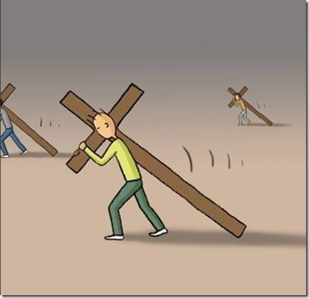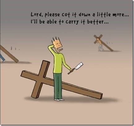 途中,有一个人忽然停了下来。他在想着什么!他想,上帝啊,这个十字架太沉重了,我可以把十字架砍掉一块!于是他动手砍了起来!