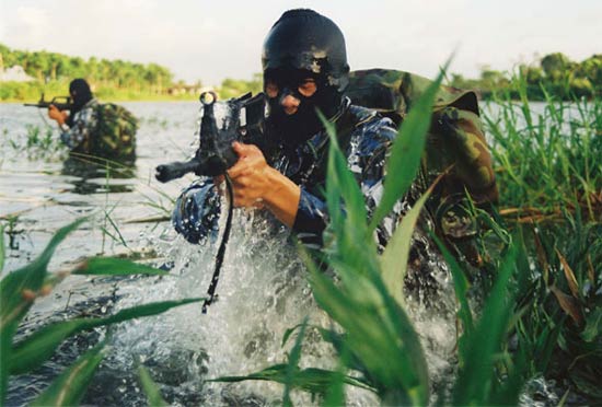 “首战用我,用我必胜”,在中国海军陆战队员面前,没有上不去的海岸。他们的足迹曾跨越南海、东海、黄海、勃海四大海区,经受过热带、亚热带、寒带不同的气候考验,接受过原始森林和南太平洋的洗礼。摸索出了一套适应现代战争条件下各种气候环境中走、吃、住、藏、打的作战方案。先后出色地完成了南沙夺礁、守礁、建礁、军事演习和抗洪救灾等任务,并为60多个国家来宾进行过军事汇报表演。美国海军陆战队总司令、四星上将凯利观看了中国海军陆战队员的表演后赞叹说:“你们不愧为世界上最优秀的海军陆战队之一!”   蓝疆碧海铸辉煌。中海军陆战队员用过硬的本领昭示世界:在未来战争中,他们是能攻善守,所向无敌的“陆地猛虎,海中蛟龙,空降神兵”。