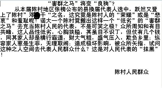 从本届陈村地区张榜公布的县换届代表人选中,跃然又登上了陈村”邓*干“之名,这究竟是陈村人的“荣耀”或是“悲哀”和羞耻呢!诺大一个陈村竟搬出这样一个“低劣”的“害群之马”去充当陈村人民的代表,不是可笑之极?众所周知和有目共睹,这人品性低劣,心胸狭隘,其虽目不识丁,但仗有几个钱,同其家人却是横行霸道,财大气粗,盛气压入,欺负乡里;纵容家人惹是生非,无理取闹;造成极坏影响,被众所矢指。试问这种之人空间去代表人民群众什么?这是对人民代表的“抹黑”!