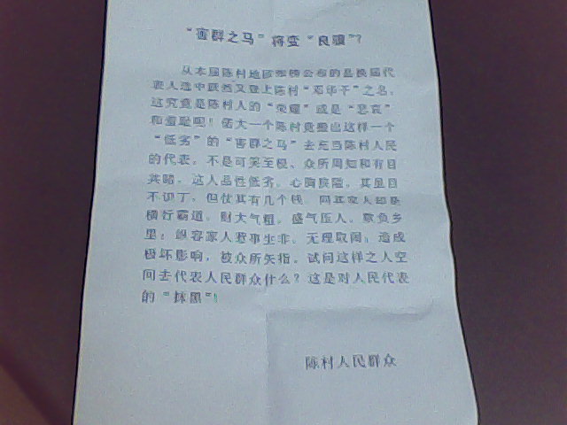 哦.是那个说话沙哑巴亏的什么狗屁村委书记;在陈村纵父纵母欺邻霸里.其侄子更是狗仗人势.凭它一身蛮力到处打人...花几个臭钱选什么代表.任他选去.反正领导同意的事......?