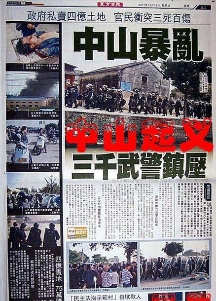 2011年11月12日早上,中山市派出上千武警到场镇压,见人就打,见车就砸扔到河里去,村民无奈只好作出反抗,动用汽油弹、煤气瓶还击,双方发生激烈冲突,造成至少一人死亡数十名村民受伤,二间工厂被烧掉,十多名警察被烧伤。