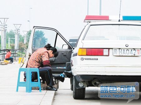[attachmentid=281053]一辆悬挂福建省南平市牌照的警车停在浙江省衢州市路边,一只脚从警车伸出来,一位擦鞋妇女坐在车门口,正在低头擦鞋。